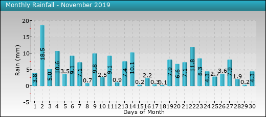 | 18 | 12.9 | 3.8 | 7.4 | 86 | 60 | 77 | 1018.9 | 1015.7 | 1017.3 | 2.6 | 8.3 | 0.1 | 100.9 | 0.0 | 7.2 | |