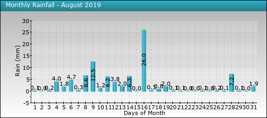 | 08 | 18.7 | 12.3 | 16.2 | 99 | 81 | 92 | 1010.7 | 999.8 | 1007.0 | 5.3 | 26.6 | 6.6 | 17.5 | 0.0 | 0.5 | |